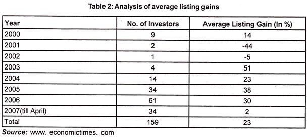 The initial public offerings through book building which has been come out in India between 2000 and 2007 is 159. Out of the 159 book-built initial public offerings, two-thirds saw listing gain. However, these gains have evaded sharply in recent age, while the listing gain was 38% in 2005 over 34 investors it fell to 30% in 2006 over 61 investors and to 2% in 2007 till mid-April over 34 investors.